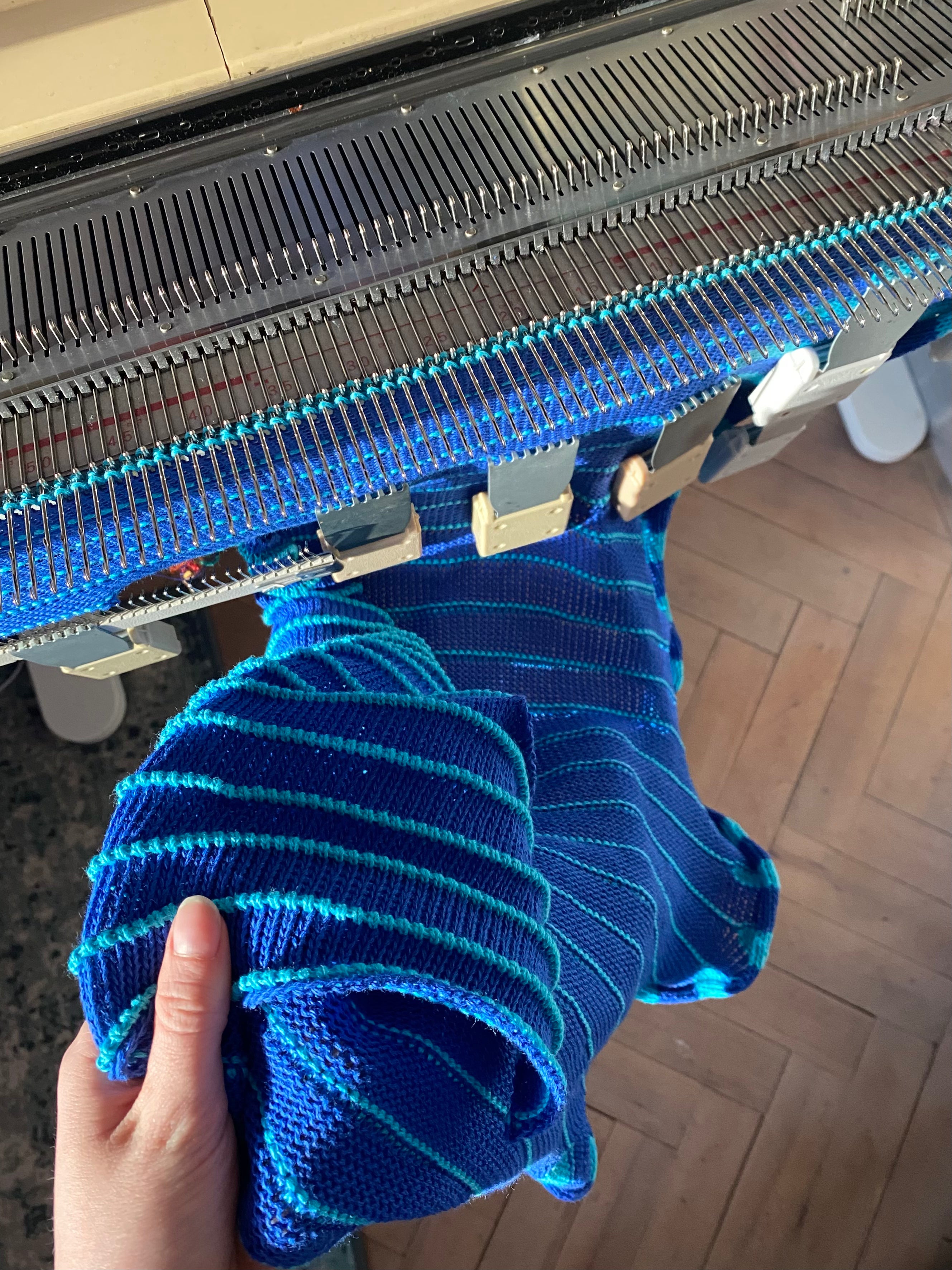 As for our pre-made designs, each piece is handcrafted in London on vintage domestic knitting machines, typically taking 6–12 hours of work per garment.